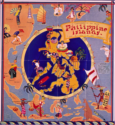 A cartograph of the major Philippine Islands. "The Riviera of the Orient". Legend - All distances are from Manila. There are 7,083 Philippine Islands. 466 are over one square mile in area. A charming Art Deco map of the Philippine Islands showing the archipelago highlighted on a deep blue ground within a circular porthole. Surrounding this are details of Japan, China, Indo-China, Sumatra, Java, Bali, Australia and New Guinea. There are many brightly coloured native costumes depicted throughout the map.
