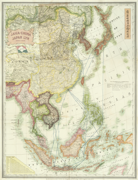 An attractive wall chart of East Asia published in London by Stanfords for the Dutch shipping line, "Java China Japan Lyn".