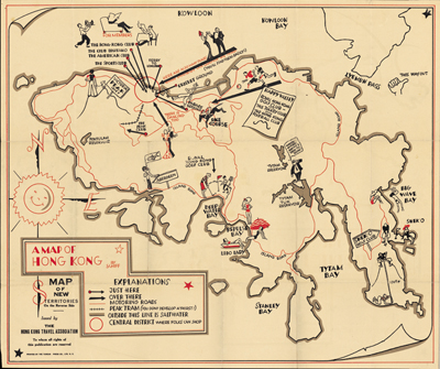 This whimsical and decorative map was created by Friedrich Schiff, a popular Austrian artist and cartoonist who was working in Hong Kong and Shanghai in the 1930s. It was published in c1938 as "A Sporting Paradise" Map of the Colony of Hong Kong.