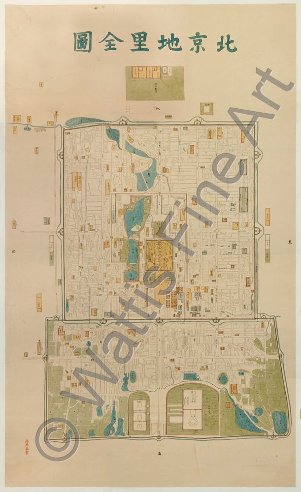 A beautiful manuscript map of Peking painted in the second half of the nineteenth century. The details of each street are precisely drawn using a very fine brush. The palaces, major buildings, lakes, city walls and gates are shown. The hand painted colour is over all bright and harmonious. Signed in red, Zhou Peichuen, lower left. This is the work of a talented artist and each line shows a steady hand. The calligraphy is particularly neat.
