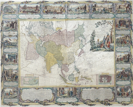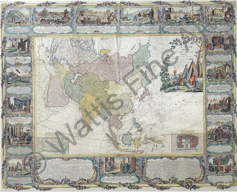 A magnificent baroque wall map engraved by Chambon,and published by Mondhare & Jean, in Paris, dates from the last years of the French Ancien Regime. It was compiled by the French geographers Longchamps and Janvier, and belongs to a sets of maps of the four continents. It Includes a wonderful rococo border with vignettes depicting the rise of the great historical empires of Asia. The extravagant cartouche pictures turbaned Turks on a tented encampment, while the insets at the bottom corners are town plans of Madras and Pondicherry, the major French settlement on the Coromandel Coast of India . The outline of the north-eastern limits of Asia is in the manner of a map of Asia by Homann Heirs published in 1754. The Sea of Korea (Mer de Coree) divides Korea and Japan. Hokkaido (Terre de D' Iesso) appears as a large island. The routes of various explorers are shown including, Antoine, Byron, Wallis and Bougainville. Also the route of the Manila galleon.