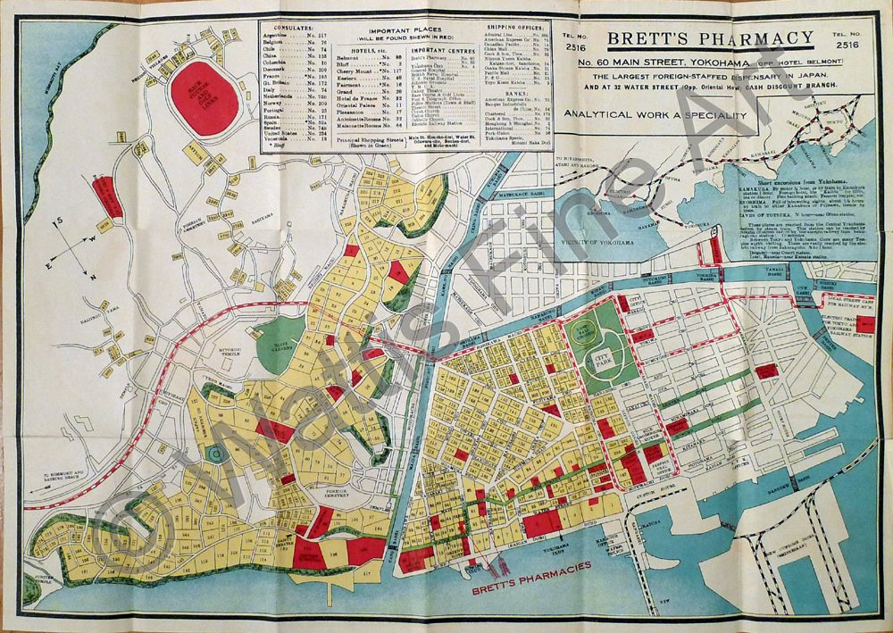 A city plan giving street names, places of interest etc and numbering each block of land. Inset shows the railway system in the vicinity of Yokohama. A very good copy of an unusual piece of travel/advertising ephemera. Originally a folded map which folds into brown paper printed covers. This map was likely given to visitors to Yokohama as it shows the main places of interest, hotels, consulates, shipping offices and banks. Serving as a promotional tool for Brett's Pharmacy "The Largest Foreign-Staffed Dispensary in Japan" the details of Brett's are printed in the upper left corner and on the map's paper covers.