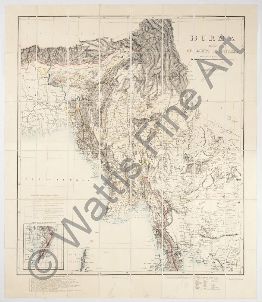 A 48-section folding map backed on canvas. Together with original case with label, Map of Burmah, Edward Stanford, 26 & 27 Cockspur St, Charing Cross, S.W.