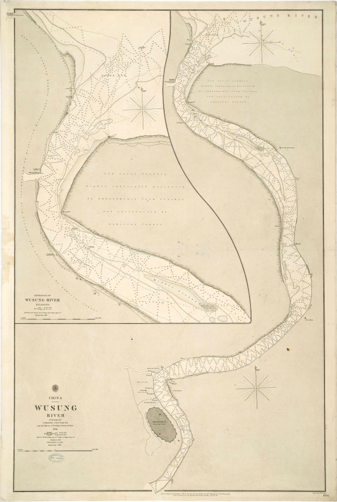 A detailed hydrographic survey of the Wusung (Whangpoo) River. It was made by Captain John Ward R.N. and the Officers of H. M. Ships Acteon and Dove in 1858. It was engraved by J. and C. Walker and published by the Hydrographic Office of the Admiralty on 25th October 1859.