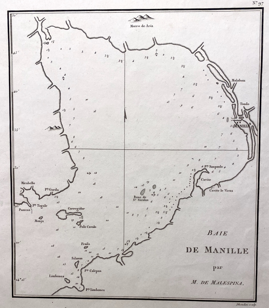 A map of the Bay of Manila originally drawn by the cartographer Felipe Bauza during the Malaspina expedition to the Philippines in 1791. It was engraved by Dhandon and published in Paris in 1808.