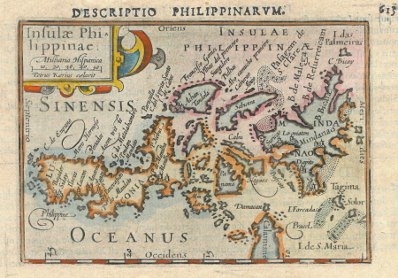The first seperate map of the Philippines was engraved by Petrus Kaerius (Peter van den Keere) in Amsterdam at the end of the sixteenth century. It was based on Jan Huygen Van Linschoten's map of the East Indies of 1595.