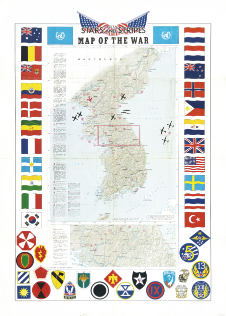 A US map of Korea from the Lorean War printed on 19th March 1953. The map shows locations of 25 actions during the war . There is also an inset map at the bottom showing key locations in what would become the border area.