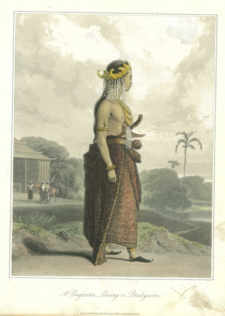 A Javanese bridegroom, standing in profile to the right, wearing traditional ornate golden jewellery including a head piece, arm bands, cuffs, and waistband. Plate 19 from 'The History of Java' written by Sir Thomas Stamford Raffles (1781-1826), published in two volumes, 1817.